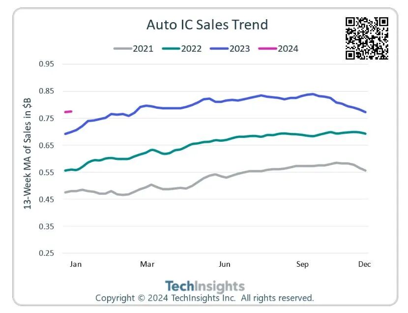 TechInsights预测, 2023年,汽车IC销售额同比飙升21%,达到420亿美元。